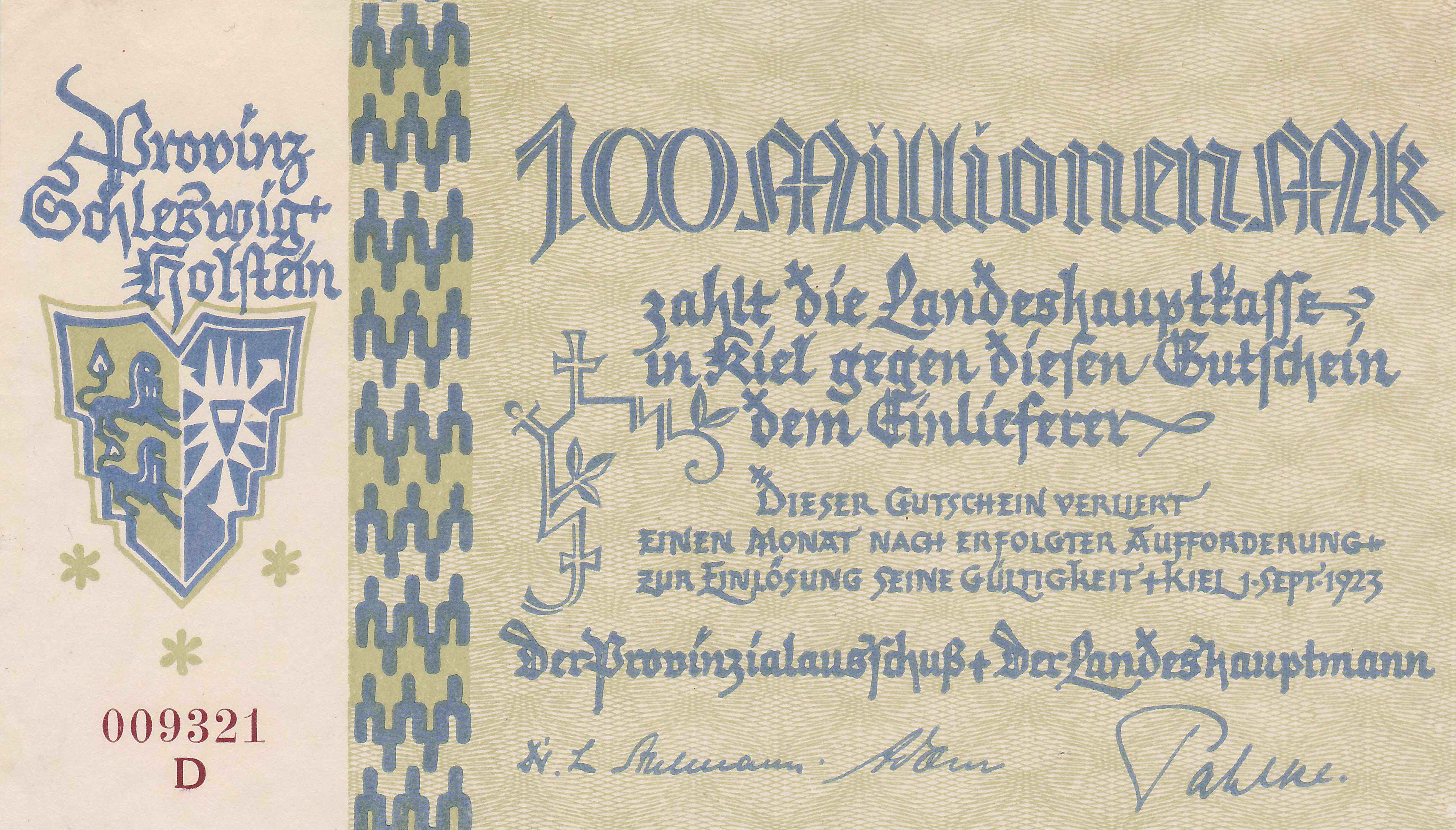 04.01.01 (100 Millionen)![]() Kiel, 01.09.1923 Kenn-Nummer: 6-stellig + braun Serie: D | Kiel in Schleswig-Holstein | Keine weiteren Varianten bekannt | Aktiv |