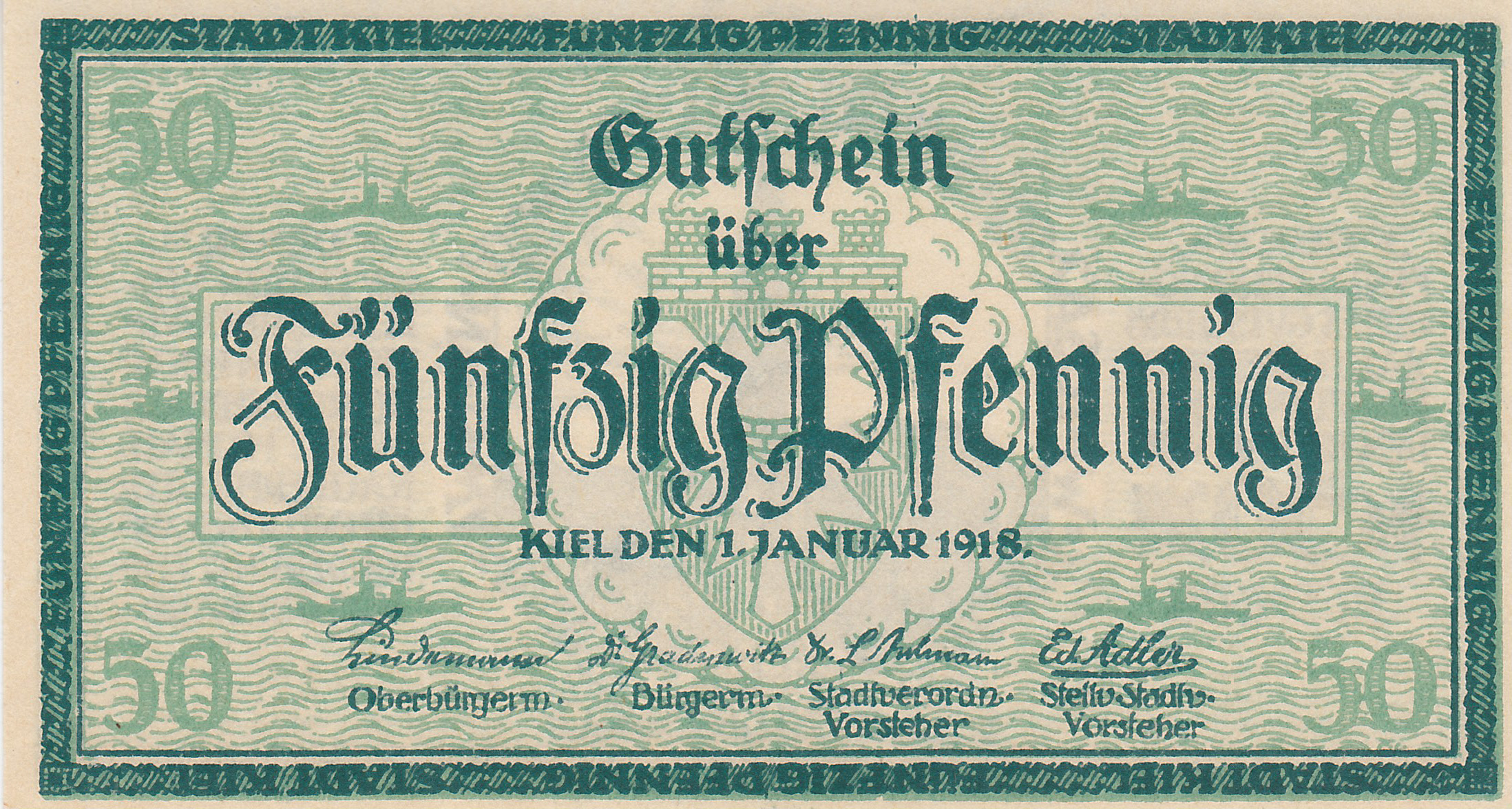 002.01.01 (50 Pfennig 1918)![]() Kiel, ohne Datum ohne Kenn-Nummer | Kiel in Schleswig-Holstein | Keine weiteren Varianten bekannt | Aktiv |